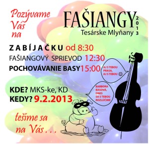 Obec Tesárske Mlyňany Vás pozýva na Fašiangy 2013, dňa 9.2. 2013. Program: Zabíjačka od 8.30 hodiny v priestoroch KSSl. (Kultúrne stredisko služieb, MKS-ka) Fašiangový sprievod od 12.30 hodiny po našej obci Pochovávanie basy o 15.00 hodine v priestoroch Kultúrneho …