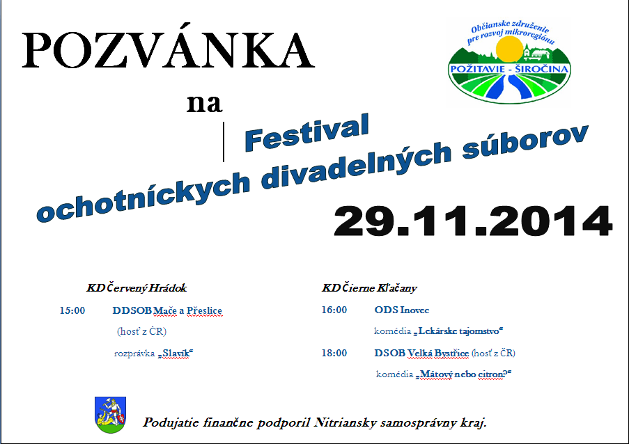Vážení občania, srdečne Vás pozývame na „Festival ochotníckych divadelných súborov“, ktorý sa uskutoční v sobotu 29.11.2014 nasledovne: 15:00 Kultúrny dom Červený Hrádok, predstaví sa Dětský divadelní soubor Osvětové besedy Velká Bystřice (hosť z Čiech) rozprávkou „Slavík“. 16:00 Kultúrny dom Čierne Kľačany, predstaví sa Divadelný súbor Inovec z Čiernych Kľačian komédiou „Lekárske tajomstvo“ 18:00 Kultúrny dom …