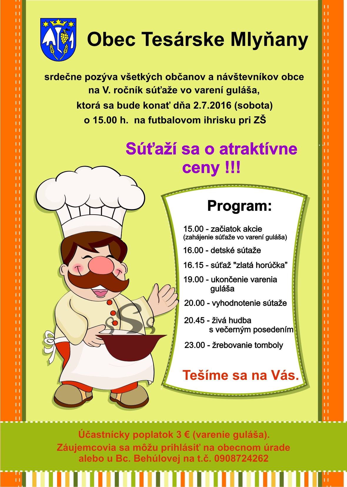 Srdečne pozývame občanov obce a návštevníkov na súťaž vo varení guláša, ktorá sa uskutoční dňa 2.7.2016 so začiatkom o 15.00 h. na futbalovom ihrisku pri Základnej škole 🙂