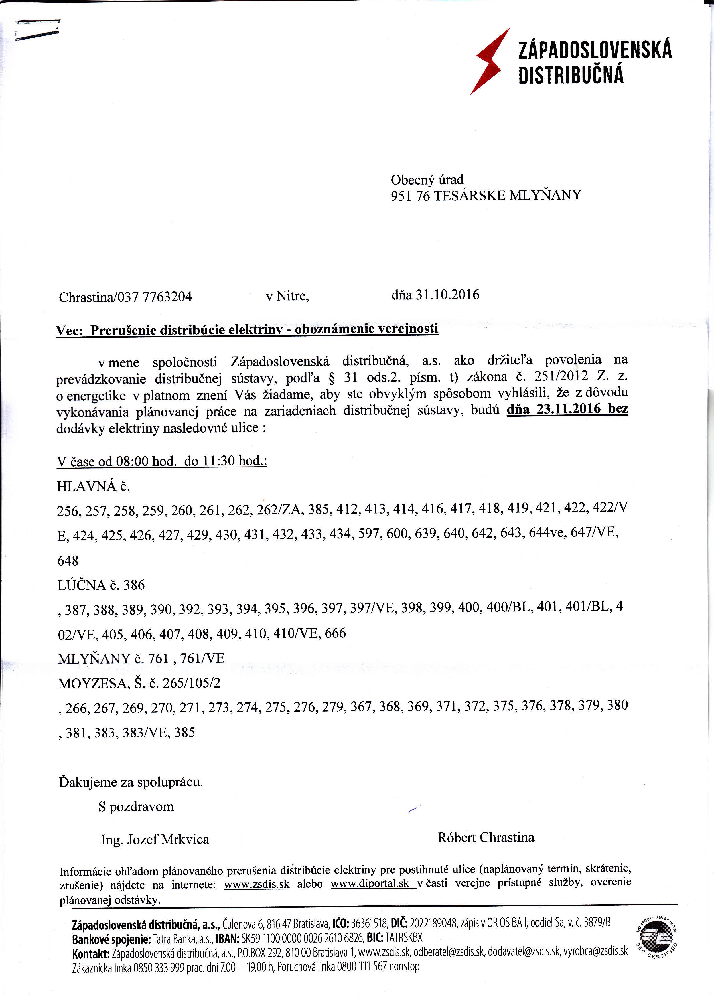 Pracovníci Západoslovenskej energetiky oznamujú občanom, že z dôvodu vykonávania plánovanej práce na zariadeniach distribučnej sústavy bude odstávka elektriny v našej obci dňa 23.11. 2013 v čase od 8.00 – 11.30 na nasledovných uliciach: