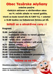 Oznamuje všetkým obyvateľom obce, že dňa 24.6.2017, t.j. v sobotu sa uskutoční v obci Nemčiňany súťaž vo varení guláša v pôsobnosti Mikroregiónu Požitavie – Širočina. Obec Tesárske Mlyňany má záujem delegovať jeden súťažný tím (s materiálnou podporou obce). V prípade záujmu sa ozvite na t. č. 0908724262, prípadne na behulova@tesarskemlynany.sk