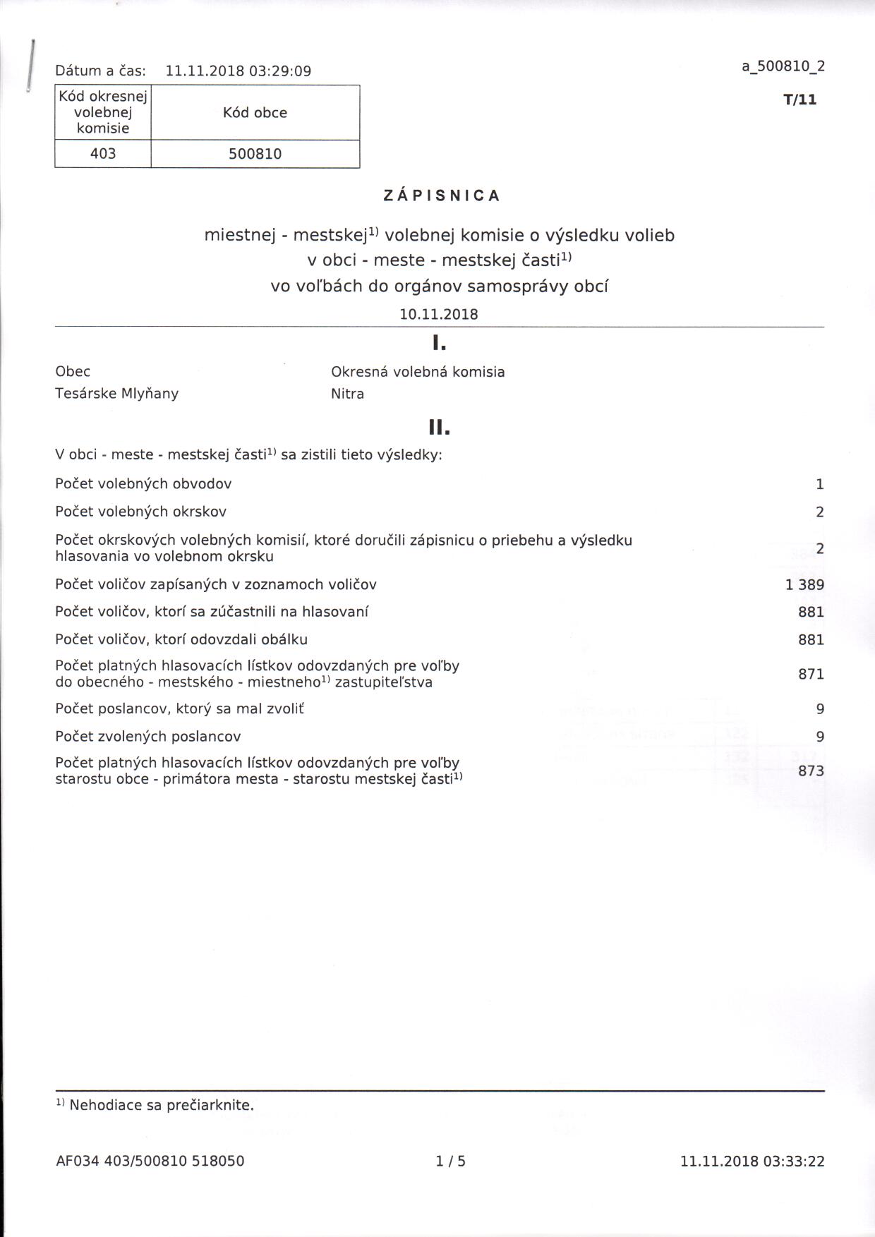 v obci Tesárske Mlyňany vo voľbách do orgánov samosprávy obcí konaných dňa 10.11.2018.