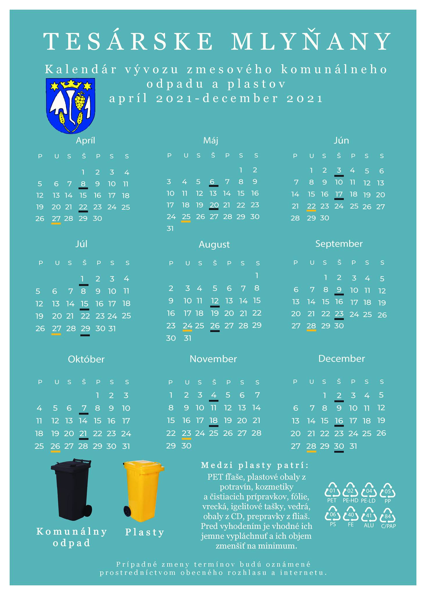 Obec Tesárske Mlyňany zverejňuje harmonogram vývozu tuhého komunálneho odpadu a plastov