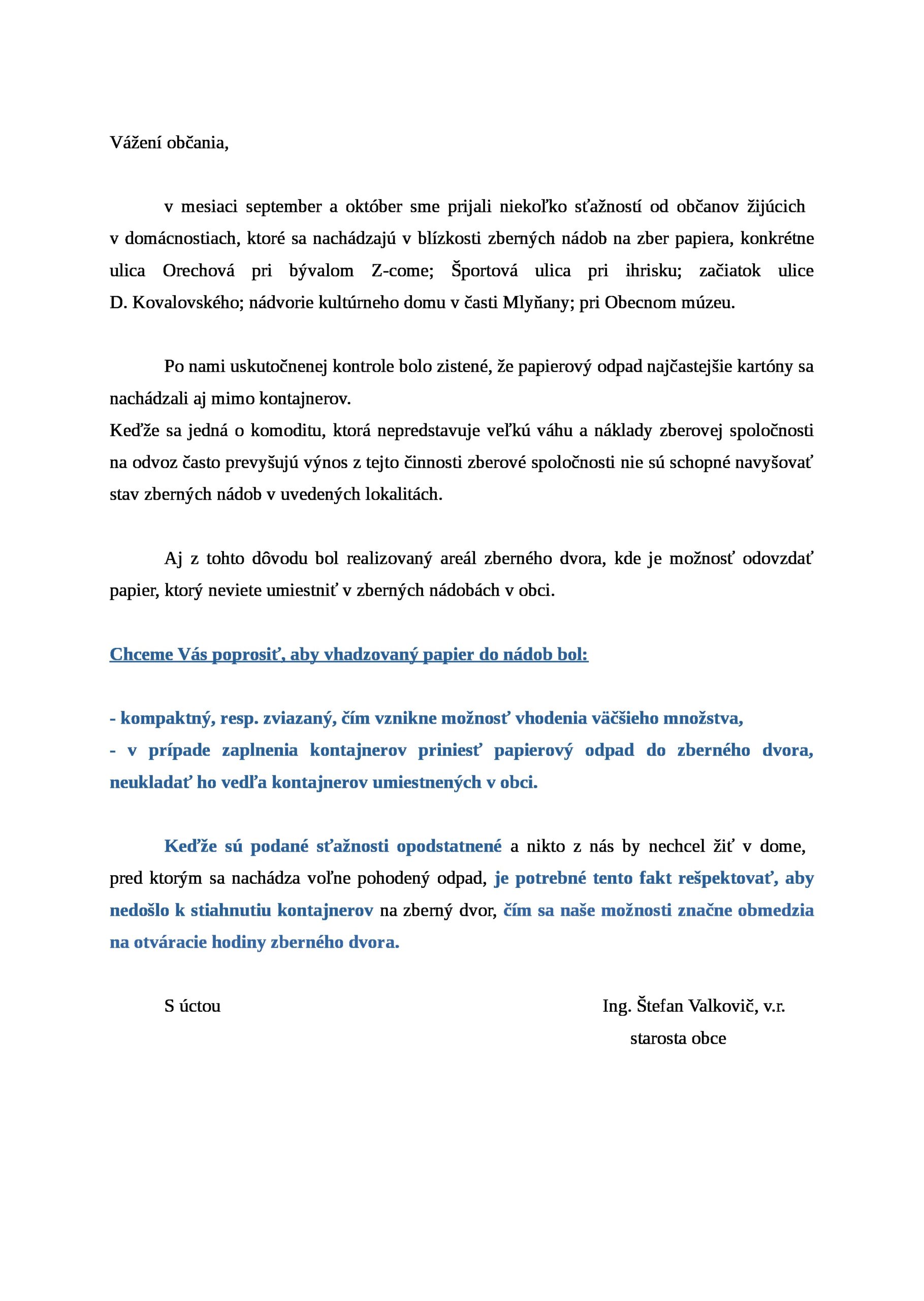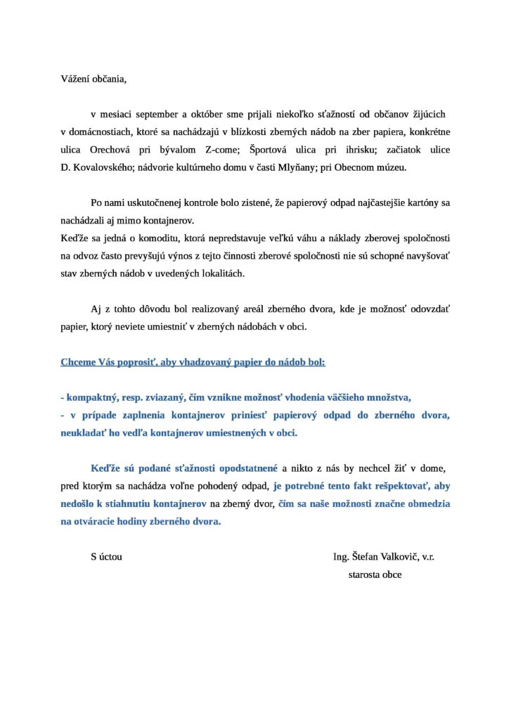 List občanom k zberu papiera