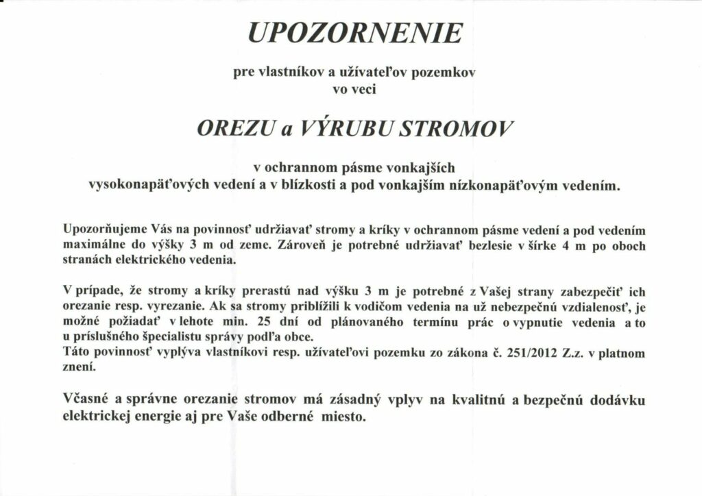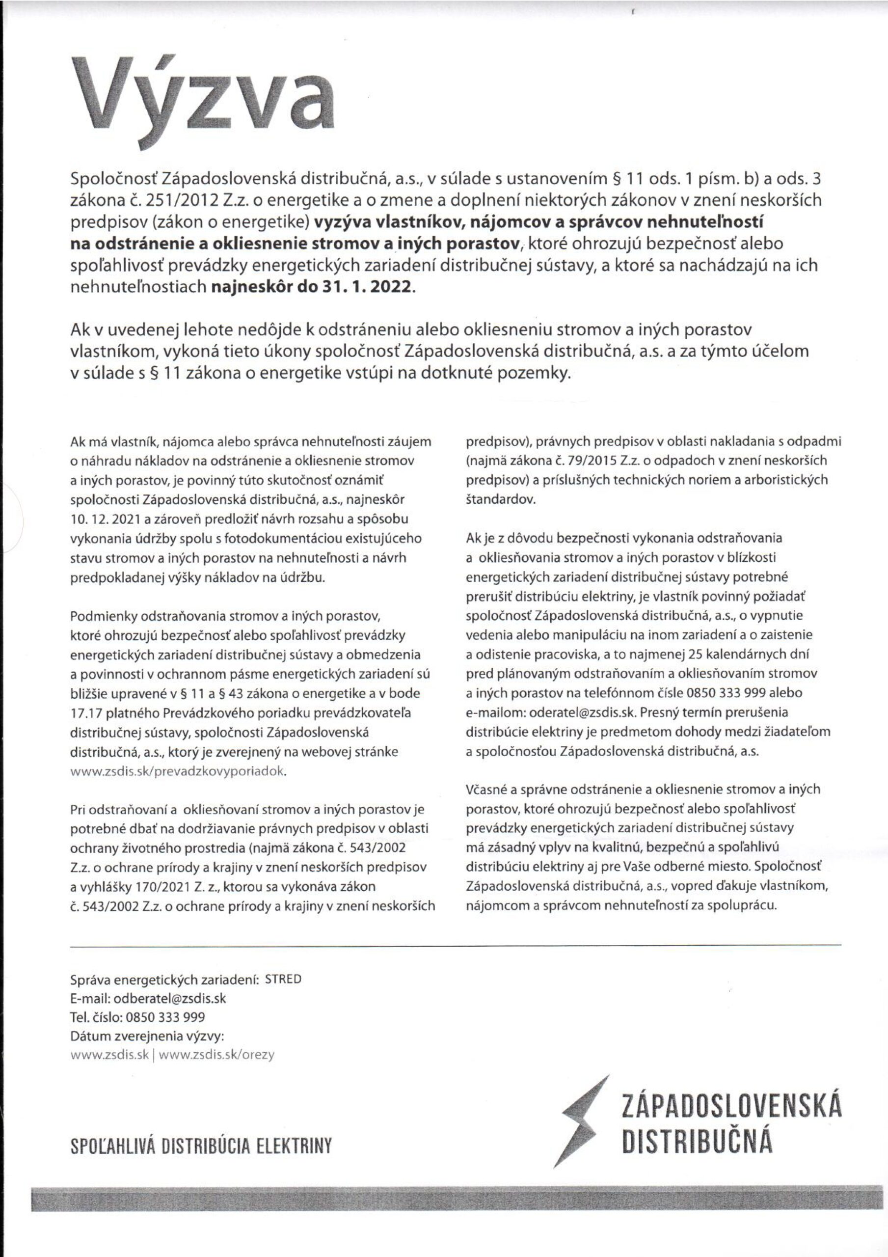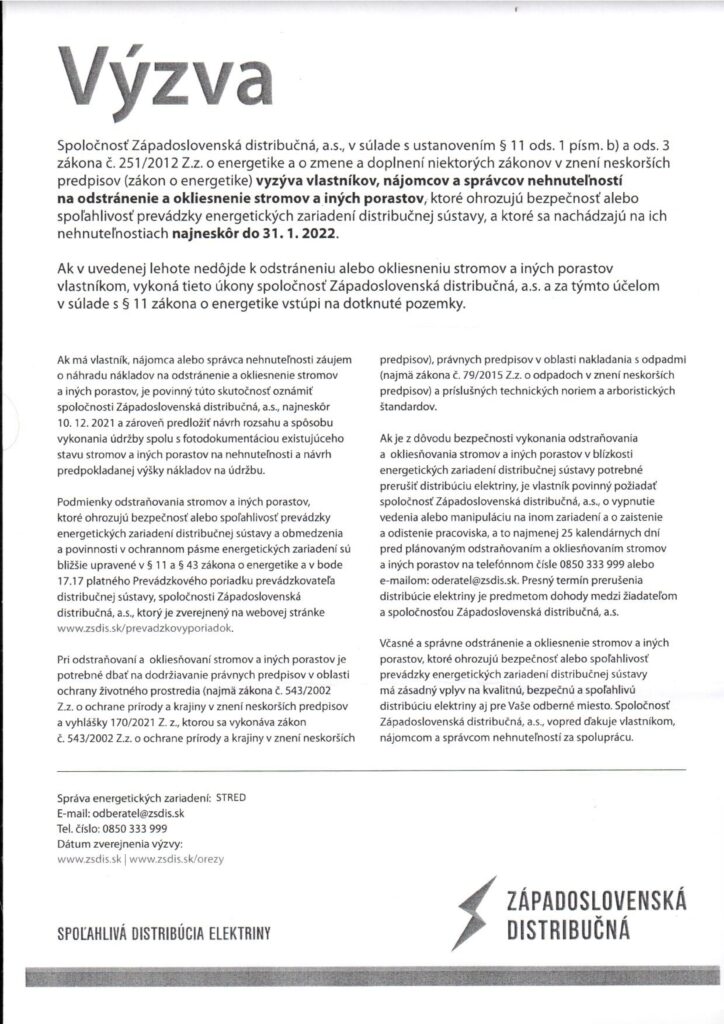 Výzva Západoslovenskej distribučnej pre majiteľov nehnuteľností vo veci odstránenia a orezania stromov a iných porastov
