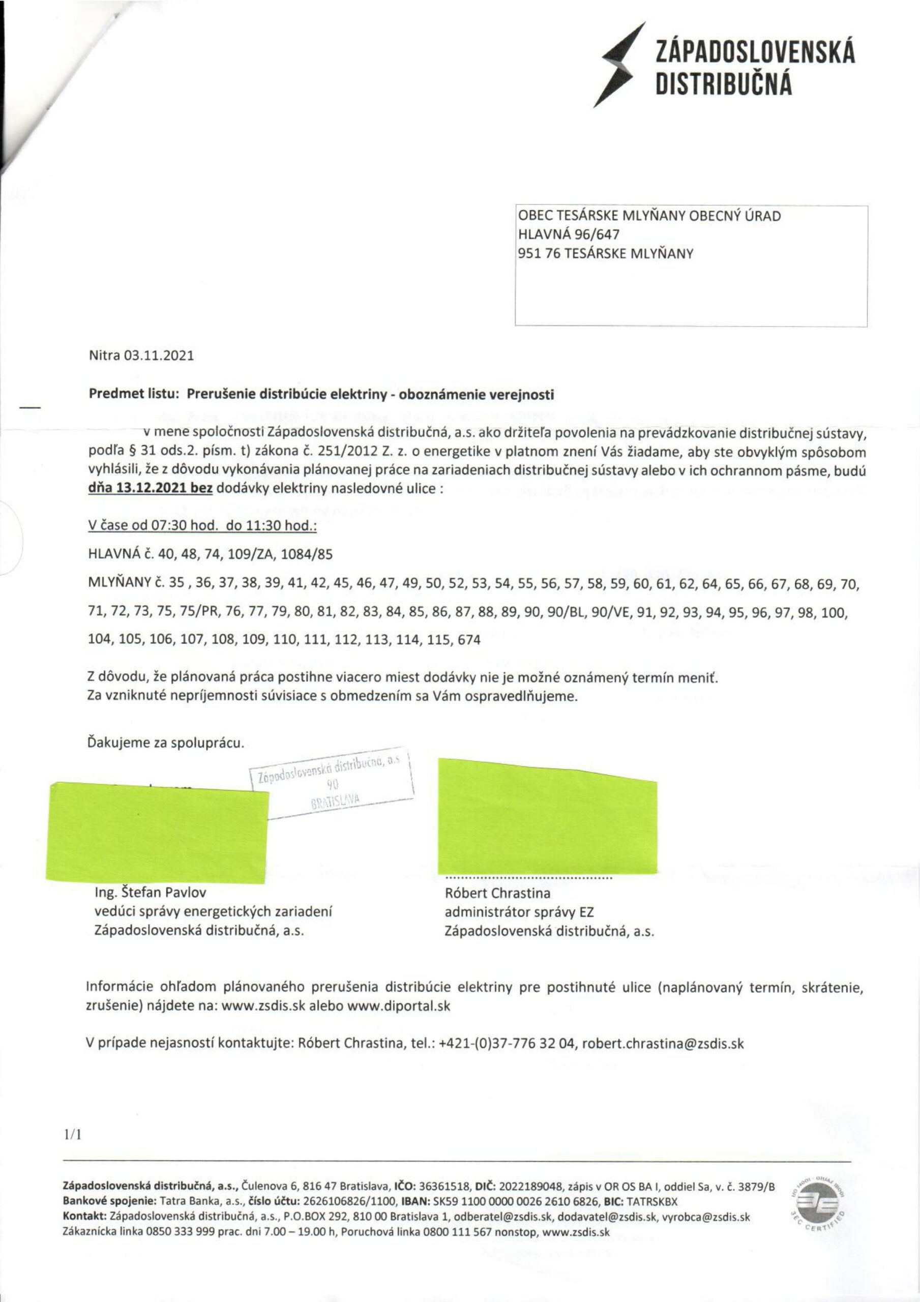 Oznámenie o prerušení distribúcie elektrickej energie dňa 13.12.2021