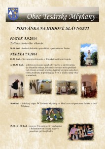 Srdečne Vás pozývame na Deň dobrovoľných hasičov dňa 4.10.2014, t.j. v sobotu od 13.00 hodiny na ihrisku pri ZŠ Štefana Moysesa. Program: 13.00 – sprievod hasičov od Obecného úradu Tesárske Mlyňany 13.15 – Otvorenie podujatia – školské ihrisko ZŠ Štefana Moysesa 13.30 – Súťaž vo varení gulášu 15.00 – Ukážka zásahu hasičov HaZZ Zlaté Moravce …