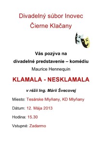 Divadelný súbor Inovec Čierne Kľačany pozýva občanov na divadelné predstavenie od Maurice Hennequina KLAMALA – NESKLAMALA, ktoré sa uskutoční dňa 12.05.2013, t.j. v nedeľu o 15.30 hod. v sále kultúrneho domu v Tesárskych Mlyňanoch. Divadelná komédia v troch dejstvách prináša množstvo komických situácií, keď hlavná predstaviteľka malým klamstvom so zapožičaným dieťaťom, chcela prinútiť manžela, aby …