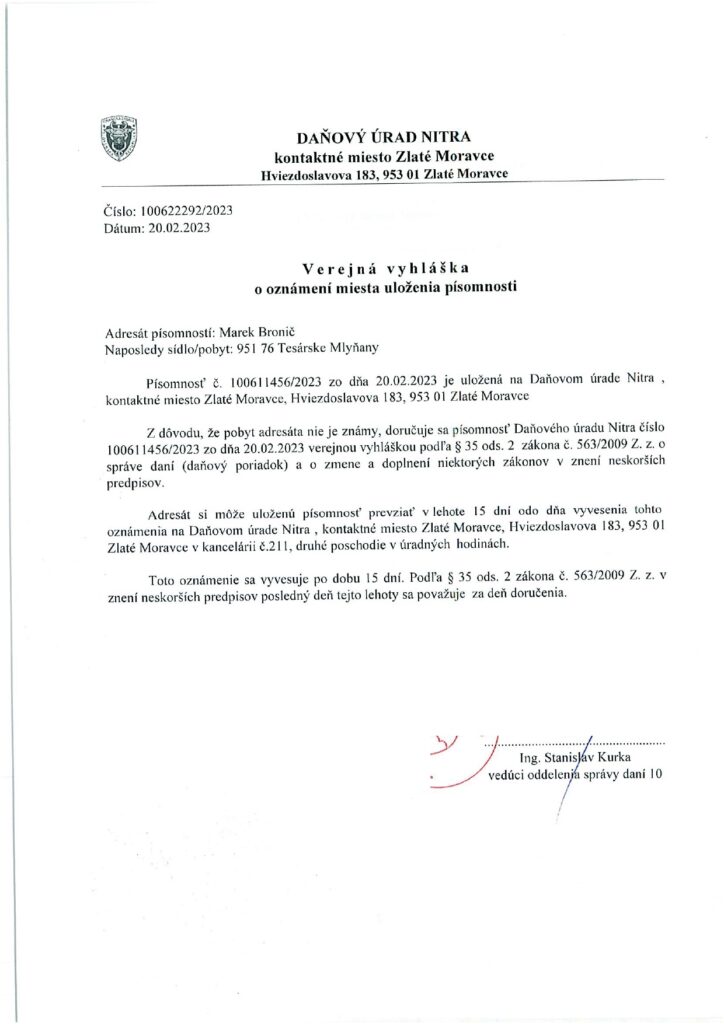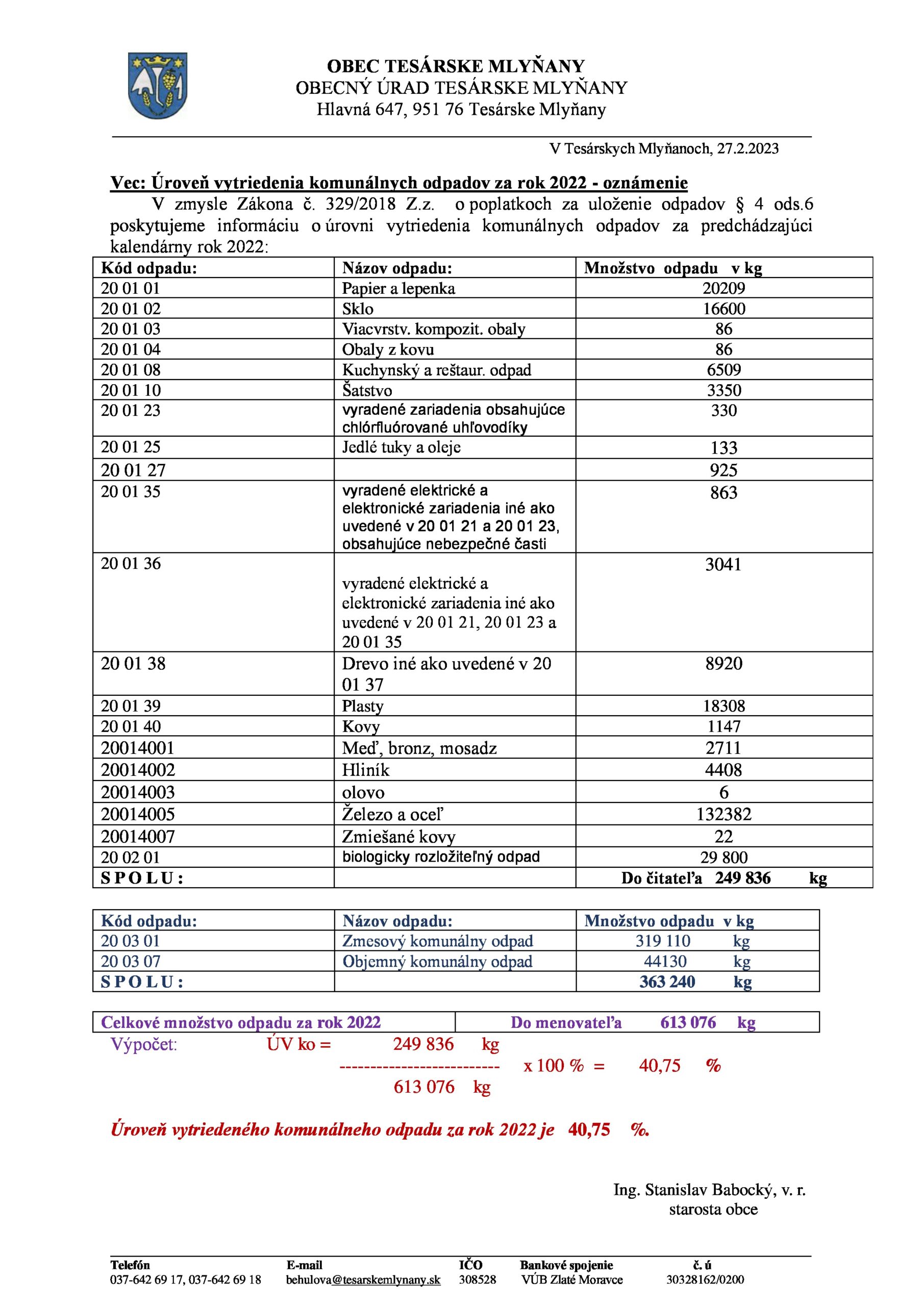 V zmysle § 5 zákona č. 253/1998 Z. z. o hlásení pobytu občanov Slovenskej republiky a registri obyvateľov Slovenskej republiky v znení neskorších predpisov oznamujeme uloženie zásielky od VÚB Generali pre adresáta Aleksandar Babenko. Zásielku si môžete vyzdvihnúť na Obecnom úrade v Tesárskych Mlyňanoch