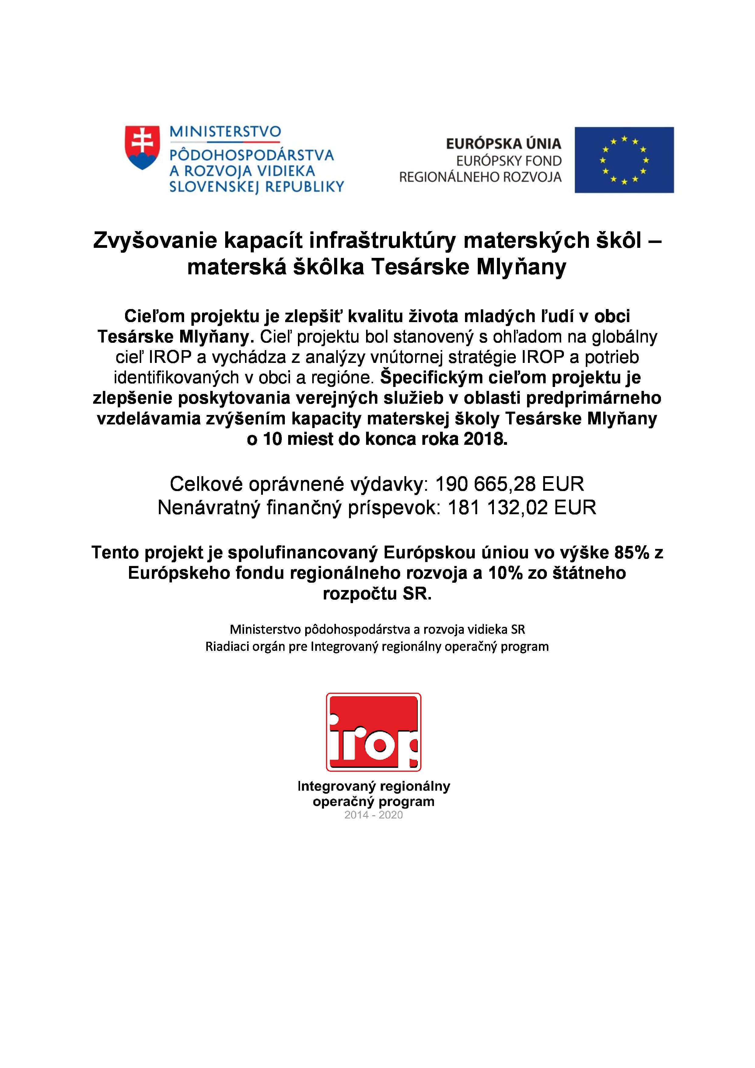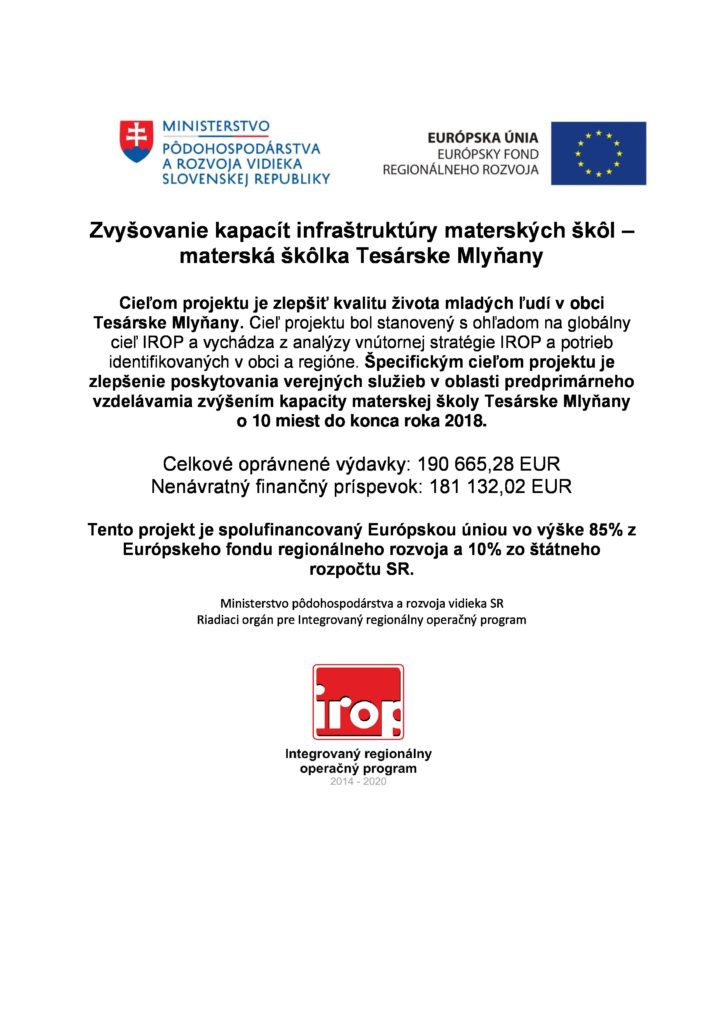 Projekt: Zvyšovanie kapacít infraštruktúry materských škôl – materská škôlka Tesárske Mlyňany